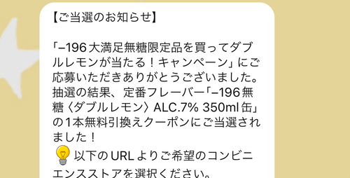 当たるのは「-196無糖ダブルレモン」コンビニ無料引換券です。