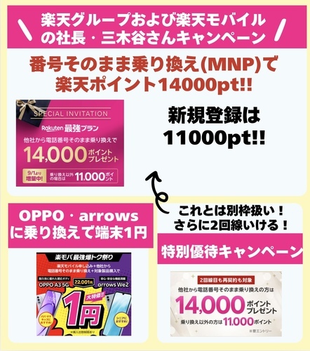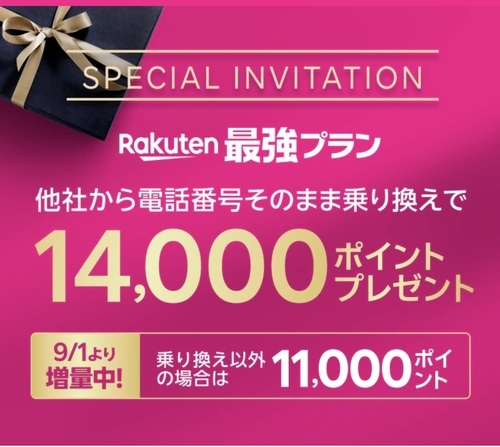 ① 三木谷さんキャンペーン│ 乗り換え14000pt・新規11000pt