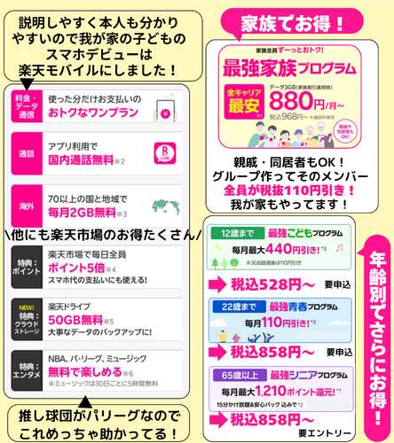 料金プランもわかりやすいし、家族全員割引きくし、子ども自体も実質安くなるから、子どもの初スマホも楽天モバイルです!