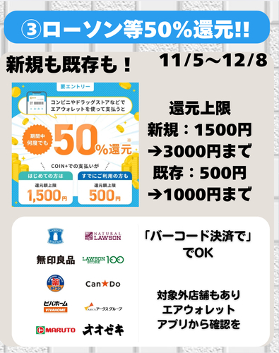 エアウォレット強い〓 ローソンも無印良品も!50%還元!