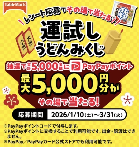 【ウエル活でも】テーブルマークうどんみくじキャンペーン|購入レシートで最大5,000名にPayPayポイント当たる