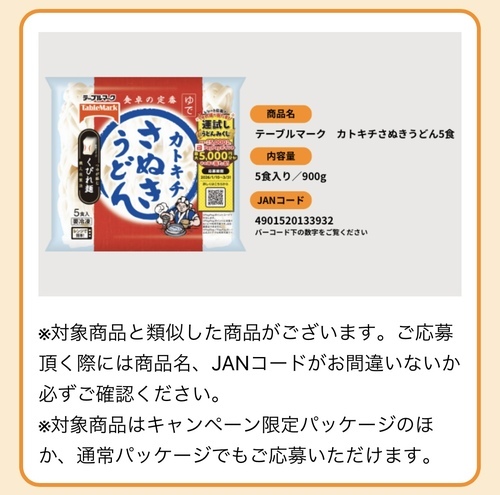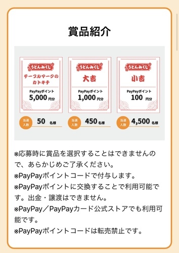 対象の「カトキチさぬきうどん」等を購入したレシートを撮影して応募すると、その場で 『うどんみくじ抽選』ができ、