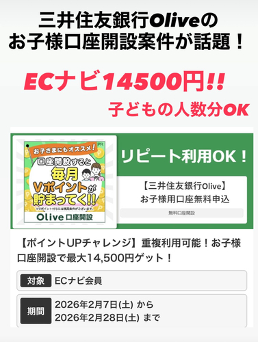 ECナビ、三井住友銀行【Olive】お子様用口座申開設で31500円!人数分OK!