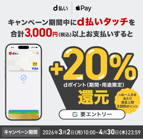 2026/3/2〜4/30の期間中、Apple Payで「d払いタッチ」を利用すると最大20%還元!さらに、はじめて設定する方は+200ポイントがもらえる超おトクなキャンペーン実施中です。