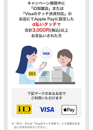 - 条件:Apple Payでd払いタッチを利用し、合計3,000円(税込)以上支払い